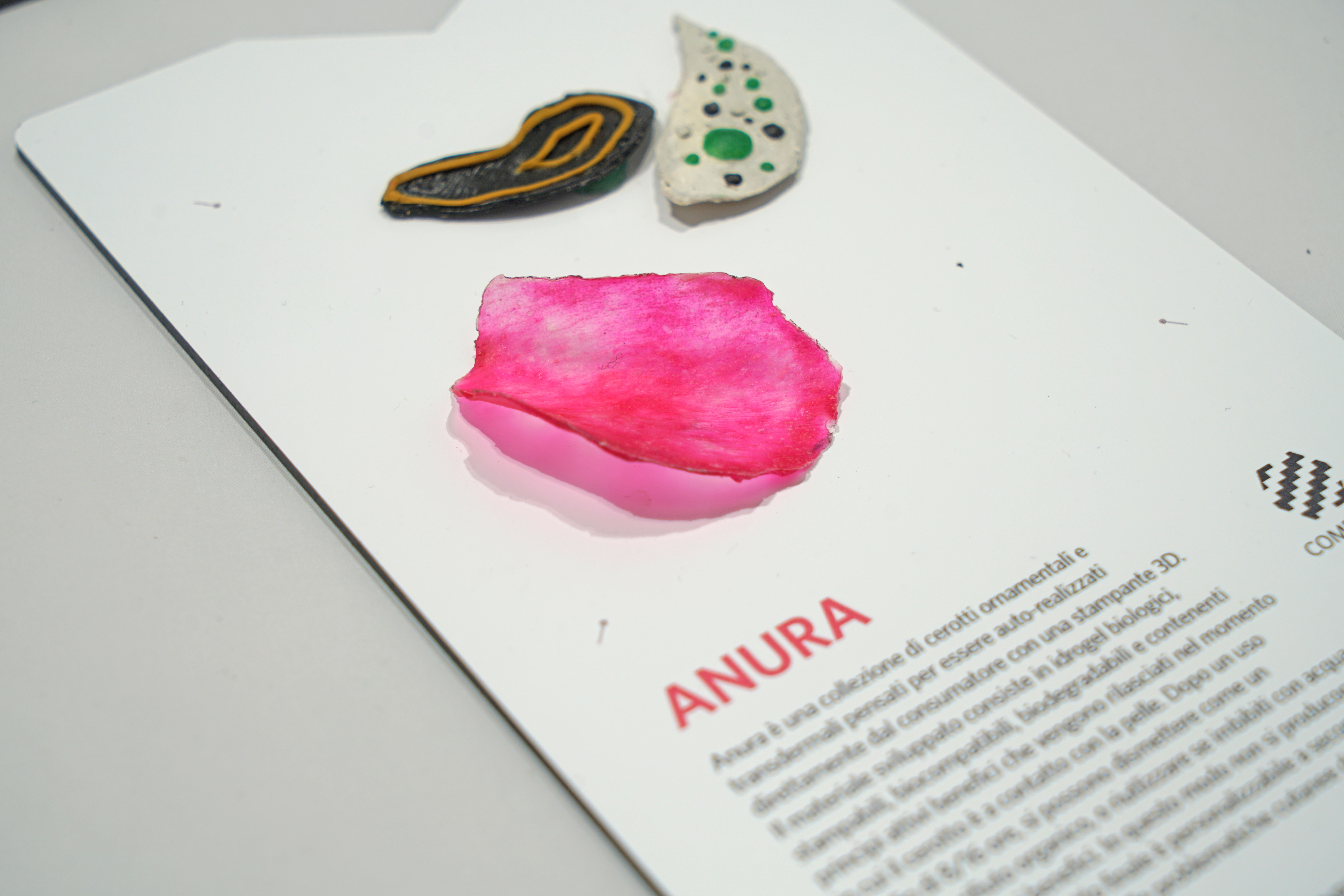 Anura è una collezione di cerotti ornamentali e transdermali pensati per essere auto-realizzati direttamente dal consumatore con una stampante 3D. Il materiale sviluppato consiste in idrogel biologici, stampabili, biocompatibili, biodegradabili e contenenti principi attivi benefici che vengono rilasciati nel momento in cui il cerotto è a contatto con la pelle. Dopo un uso medio di 8/16 ore, si possono dismettere come un normale rifiuto organico, o riutlizzare se imbibiti con acqua e altri principi benefici. In questo modo non si producono sprechi e il prodotto finale è personalizzabile a seconda dei gusti dell’utente e delle problematiche cutanee da curare.