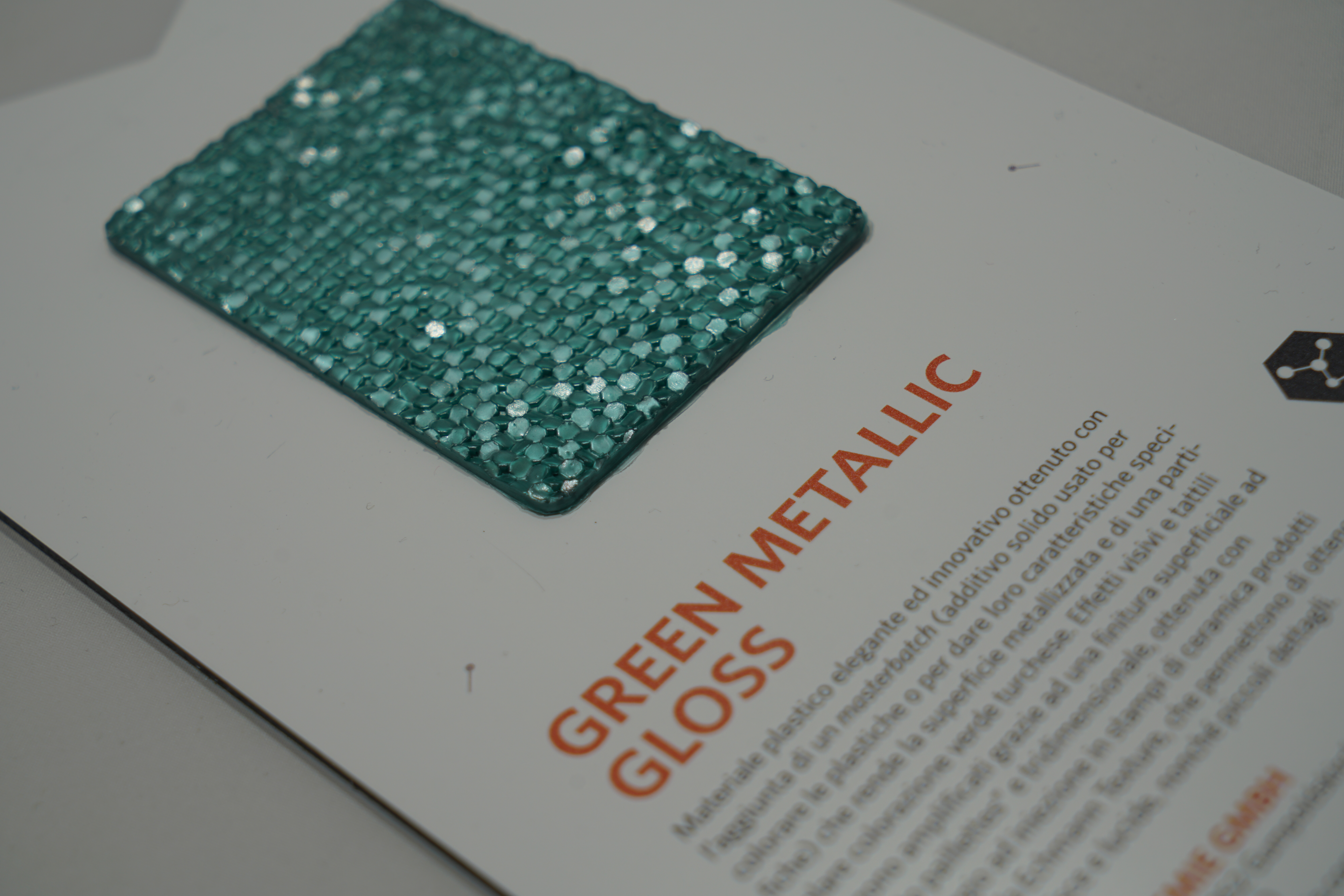 Materiale plastico elegante ed innovativo ottenuto con l’aggiunta di un masterbatch (additivo solido usato per colorare le plastiche o per dare loro caratteristiche specifiche) che rende la superficie metallizzata e di una particolare colorazione verde turchese. Effetti visivi e tattili vengono amplificati grazie ad una finitura superficiale ad ”effetto paillettes” e tridimensionale, ottenuta con stampaggio ad iniezione in stampi di ceramica prodotti dall’azienda Echmann Texture, che permettono di ottenere superfici lisce e lucide, nonché piccoli dettagli.