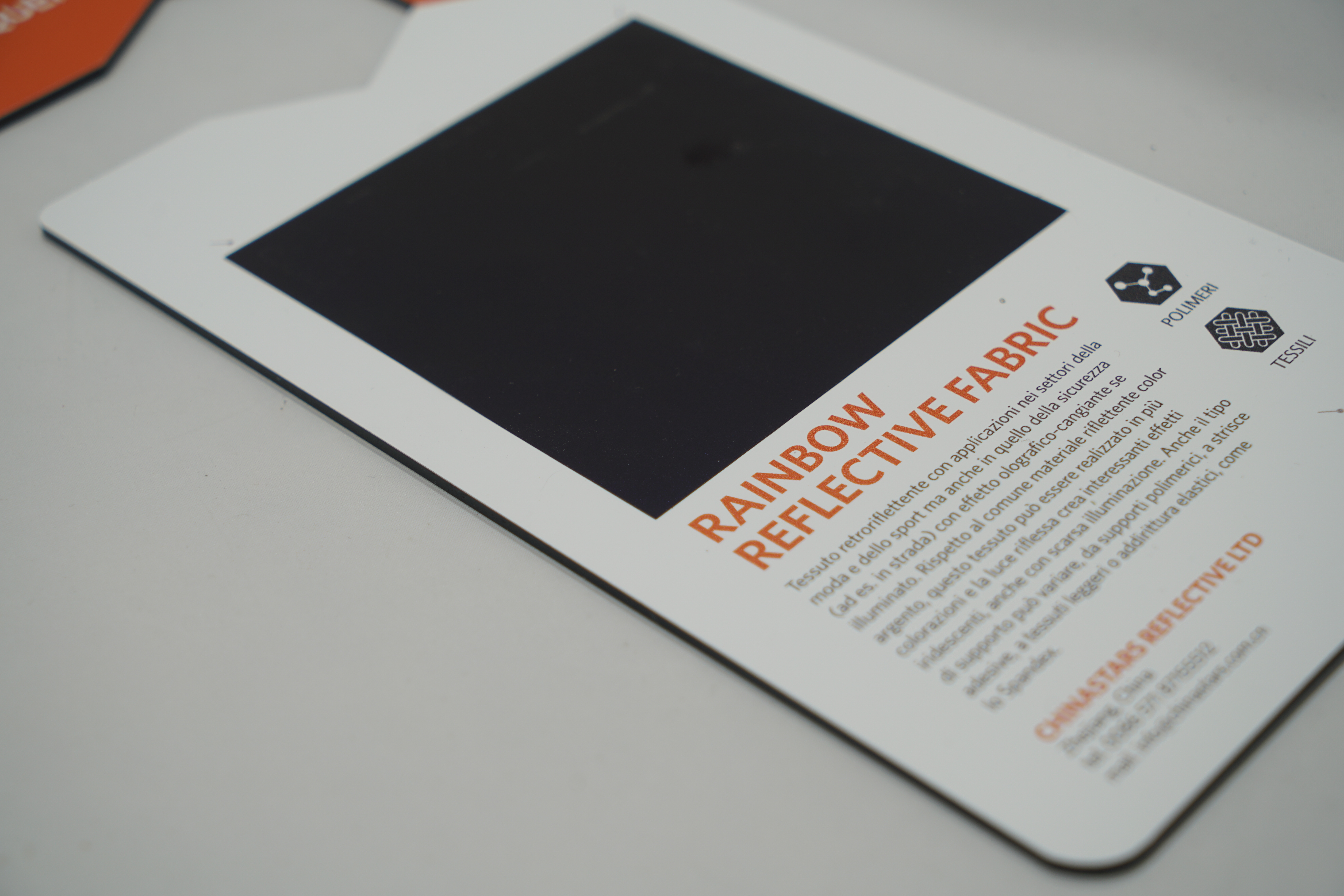 Tessuto retroriflettente con applicazioni nei settori della moda e dello sport ma anche in quello della sicurezza (ad es. in strada) con effetto olografico-cangiante se illuminato. Rispetto al comune materiale riflettente color argento, questo tessuto può essere realizzato in più colorazioni e la luce riflessa crea interessanti effetti iridescenti, anche con scarsa illuminazione. Anche il tipo di supporto può variare, da supporti polimerici, a strisce adesive, a tessuti leggeri o addirittura elastici, come lo Spandex.
