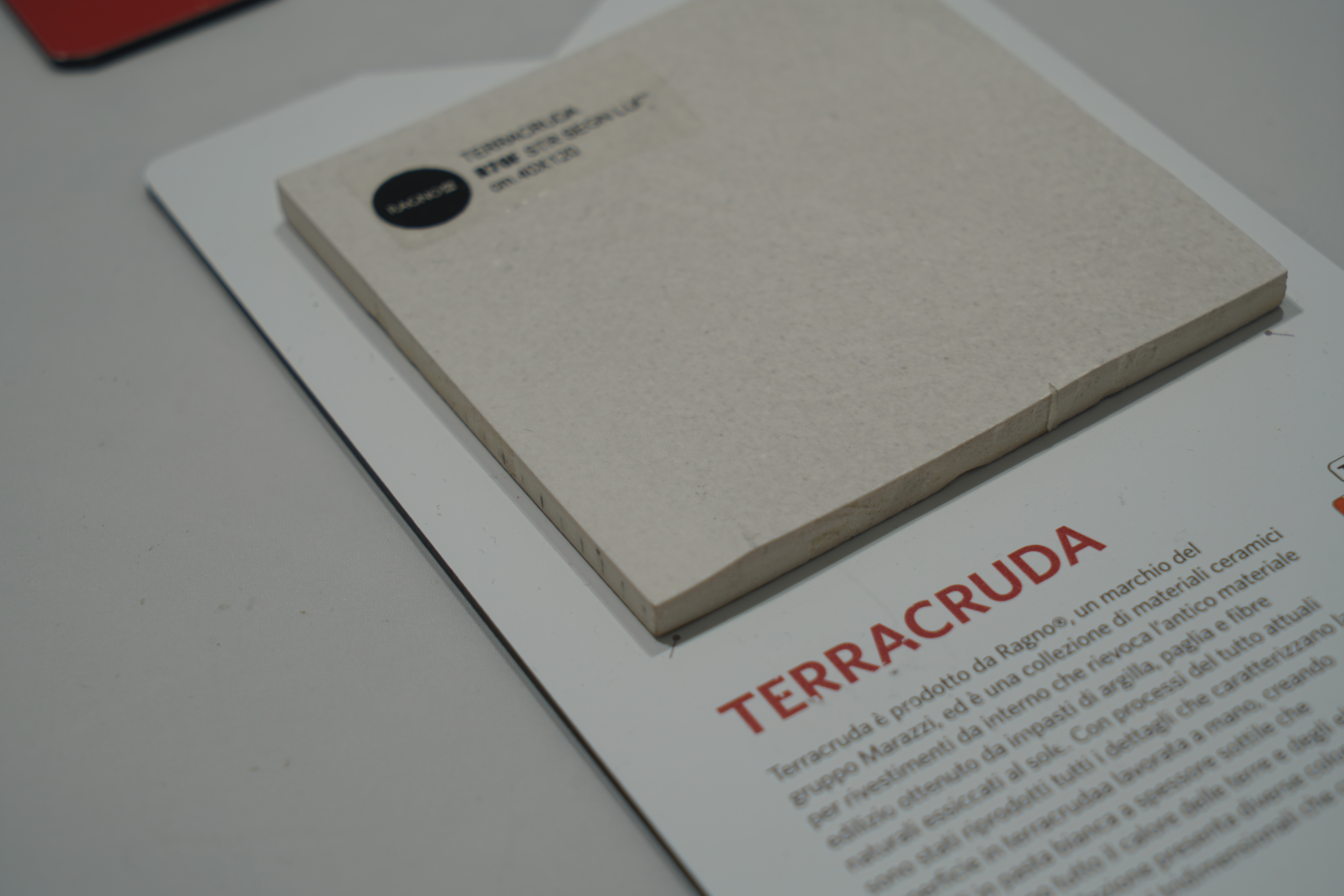 Terracruda è prodotto da Ragno®, un marchio del gruppo Marazzi, ed è una collezione di materiali ceramici per rivestimenti da interno che rievoca l’antico materiale edilizio ottenuto da impasti di argilla, paglia e fibre naturali essiccati al sole. Con processi del tutto attuali sono stati riprodotti tutti i dettagli che caratterizzano la superficie in terracrudaa lavorata a mano, creando moduli in pasta bianca a spessore sottile che trasferiscono tutto il calore delle terre e degli elementi naturali. La collezione presenta diverse colorazioni e in alcuni casi dei rilievi tridimensionali che creano eleganti movimenti di luce.